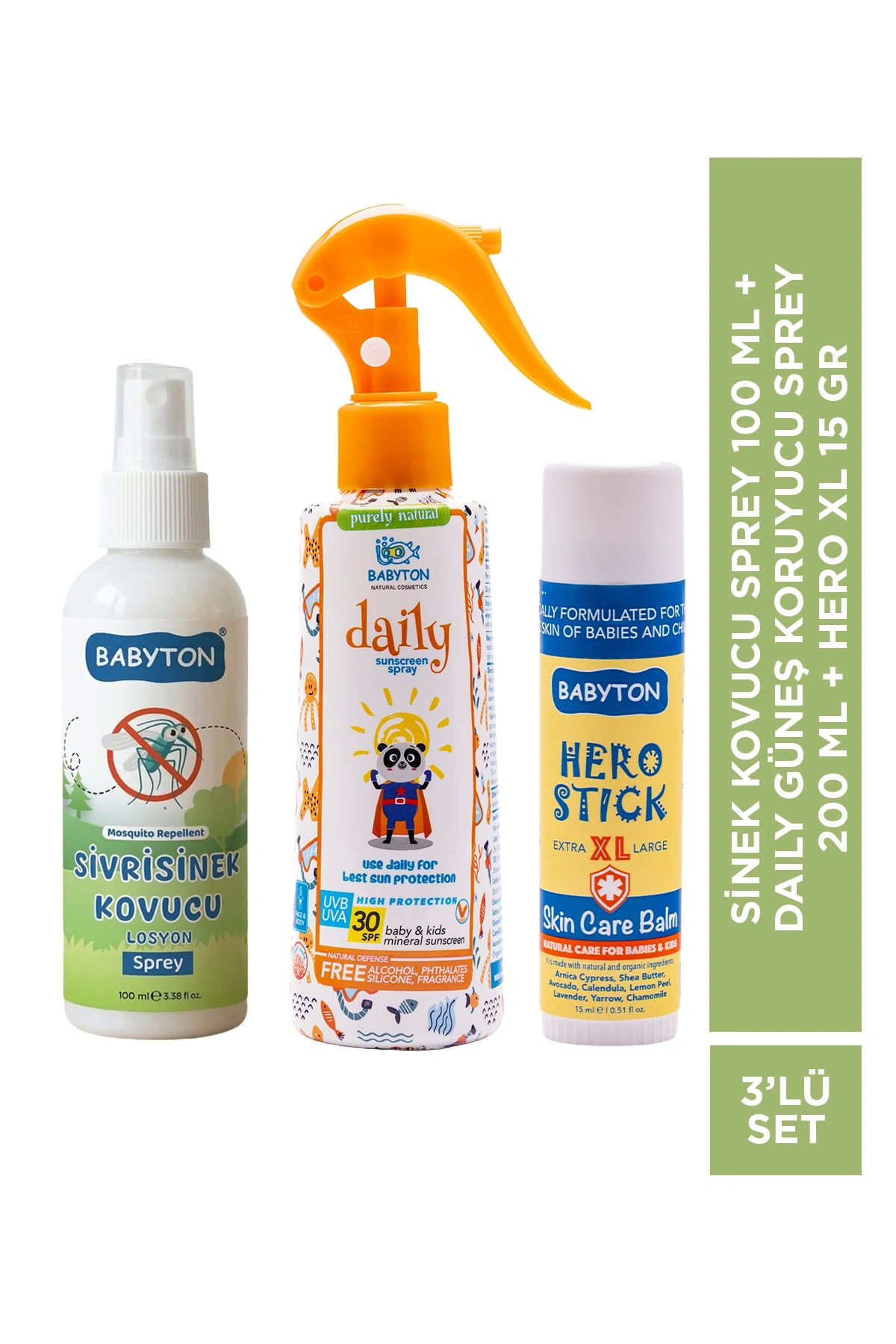 Sivrisinek Kovucu Sprey 100 ml+Daily Güneş Koruyucu Sprey 200 ml+Hero Stick XL 15 gr 3'lü Set Nazik formülü sayesinde cildi kurutmadan korur. Limon okaliptüsü yağı içeriğiyle sivrisineklere karşı doğal kaynaklı koruma sağlar. Glycerin ve Panthenol sayesinde cildi nemlendirir, yumuşatır ve kurumasını önlemeye yardımcı olur.